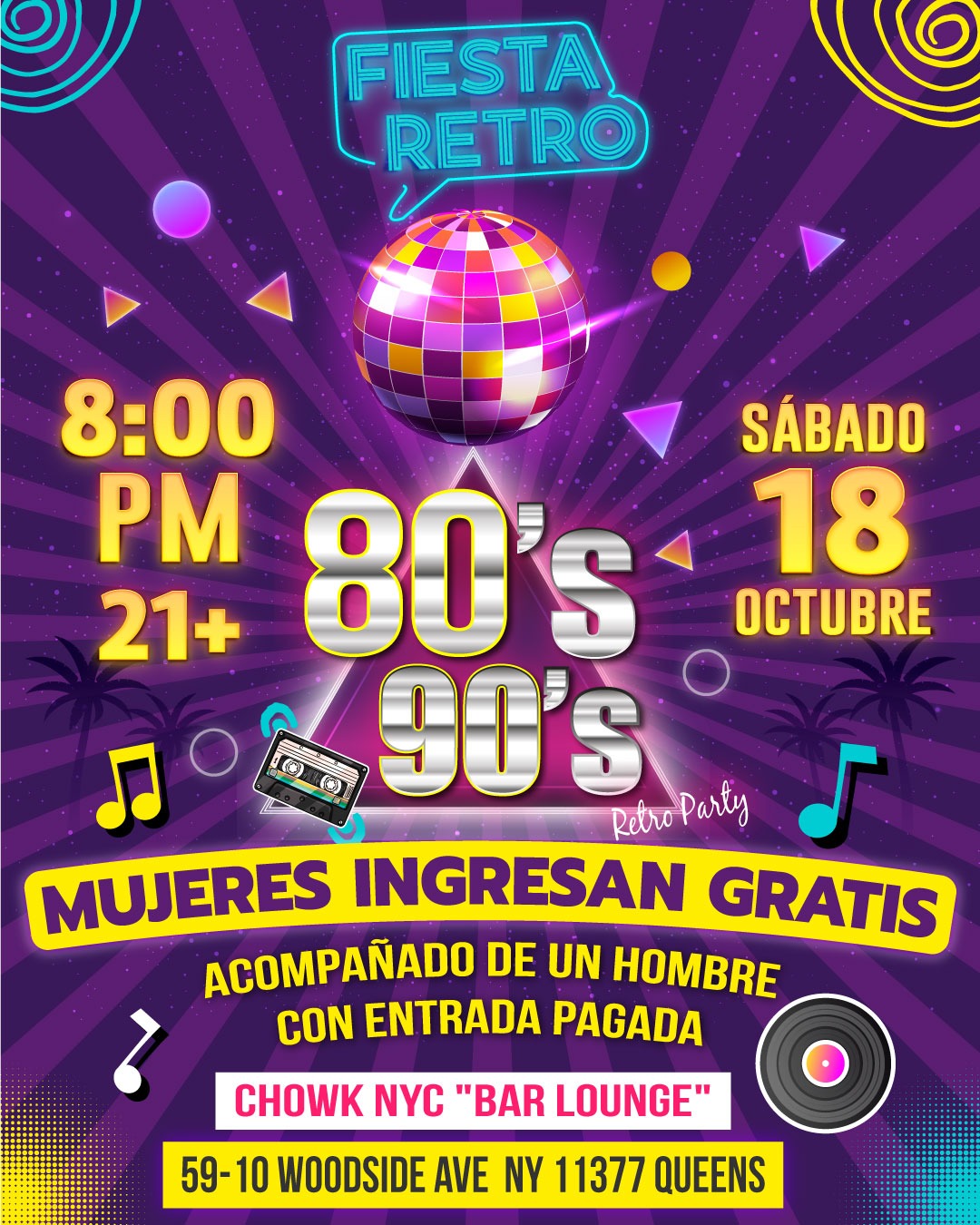 Este sábado 18 de octubre, la nostalgia y la diversión se combinan para apoderarse de Woodside con una noche que promete hacernos cantar, bailar y revivir los momentos dorados de las décadas más icónicas de la música. Gran Fiesta Retro en CHOWK NYC – Bar Lounge, donde los ritmos inolvidables de los 80 y 90 serán los protagonistas.